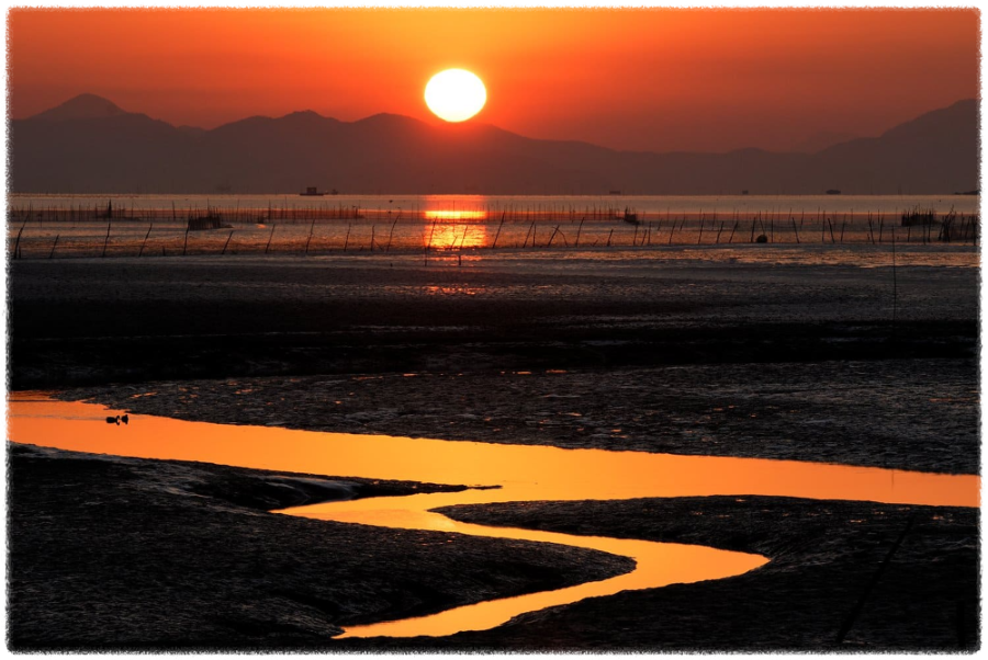 고요한 갯벌 위로 반사된 빛의 강이 굽이치며