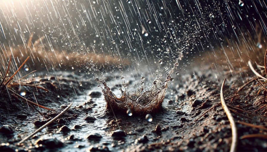 비가 내리면, 빗방울이 흙을 때리면서 작은 **에어로졸(미세 입자)**이 공기 중으로 튀어 오르고,